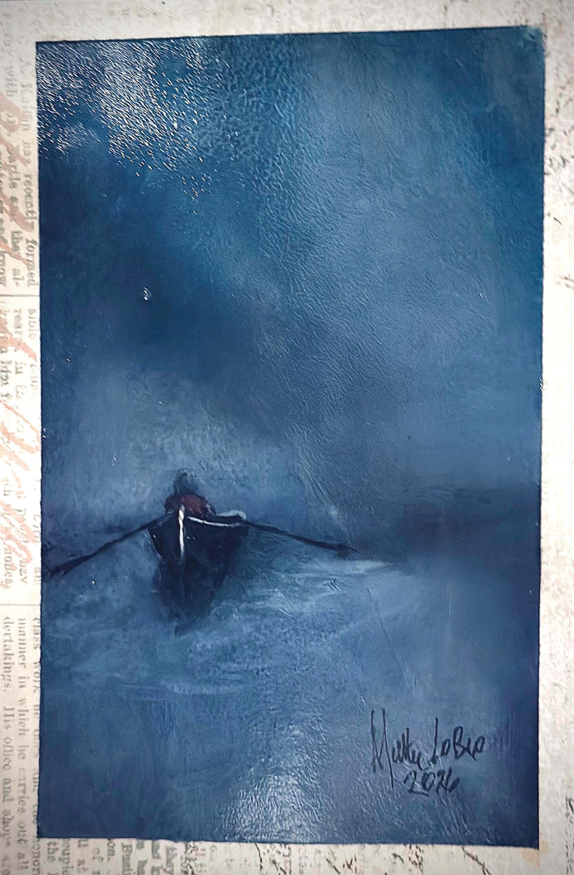 “The Journey No One Seas” is an original acrylic painting by artist Matteo LoBue, capturing a solitary boat drifting through deep, layered blues. The muted palette and fog-like texture create a sense of isolation, resilience, and quiet reflection — a reminder that the hardest journeys are often the ones no one sees.
