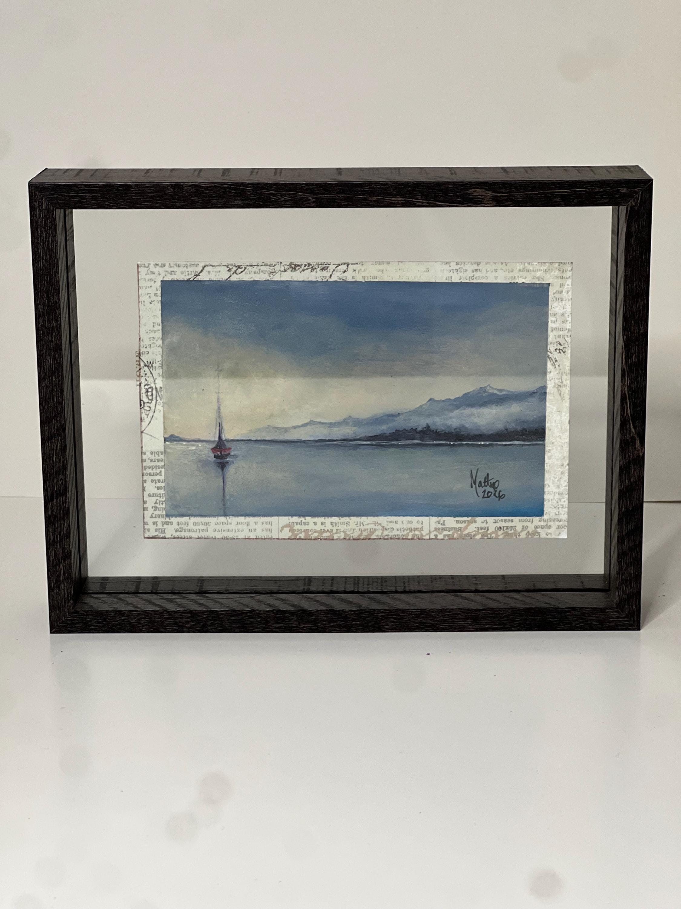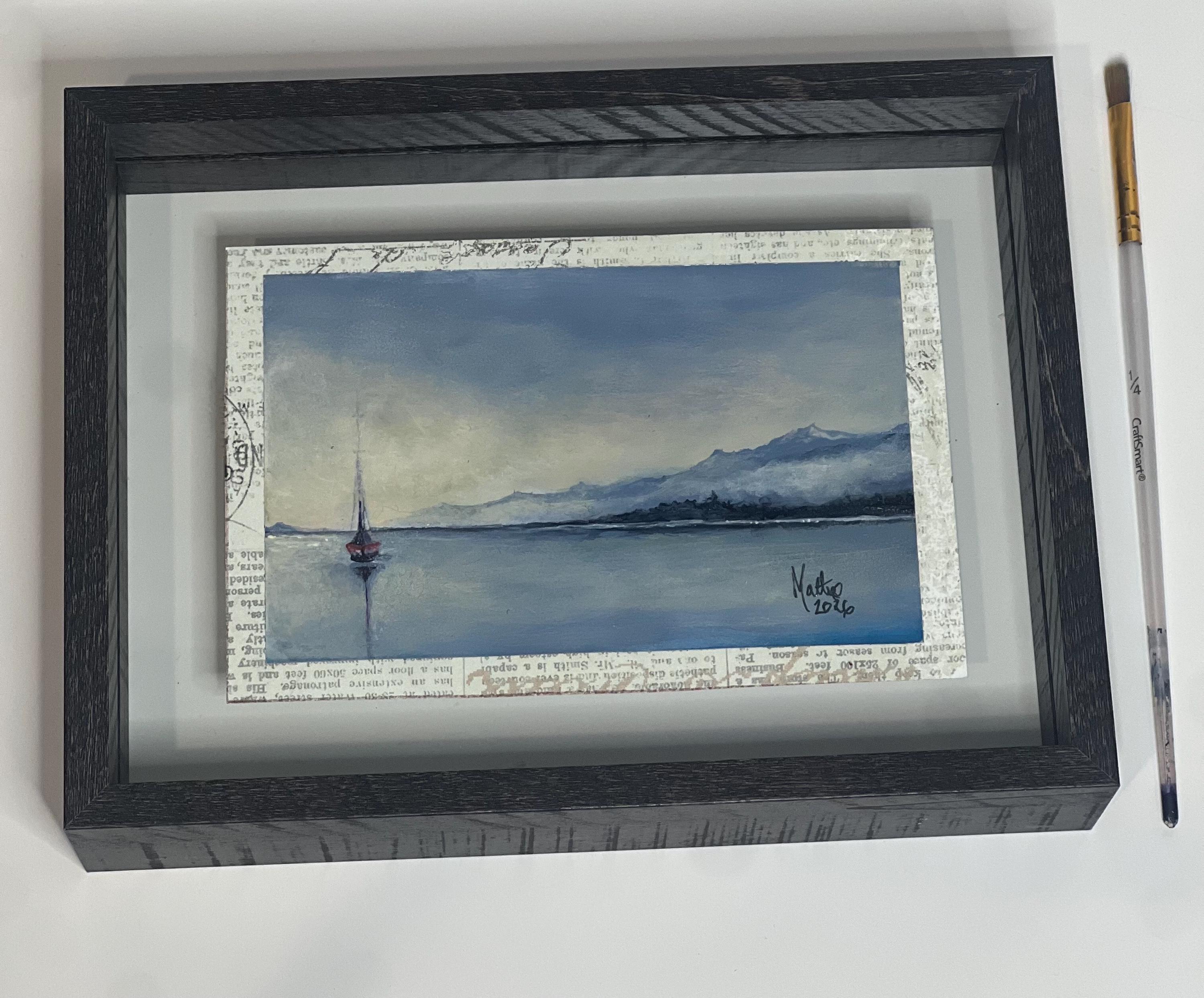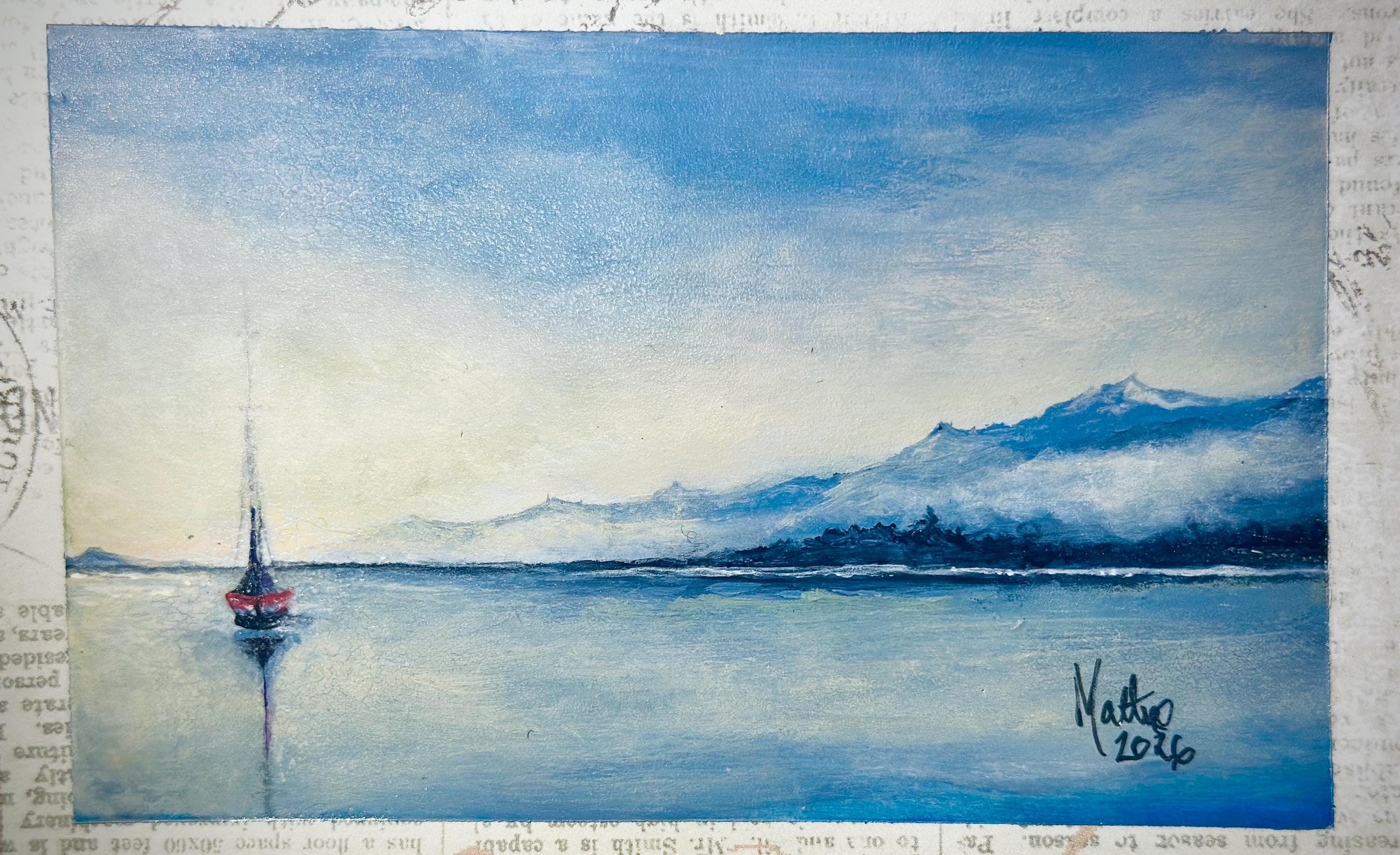 The Journey Within is an original acrylic painting by artist Matteo LoBue, depicting a solitary boat resting on calm, reflective waters beneath a quiet sky. Soft blues and subtle texture create a sense of stillness and inward focus, inviting the viewer to pause and reflect.