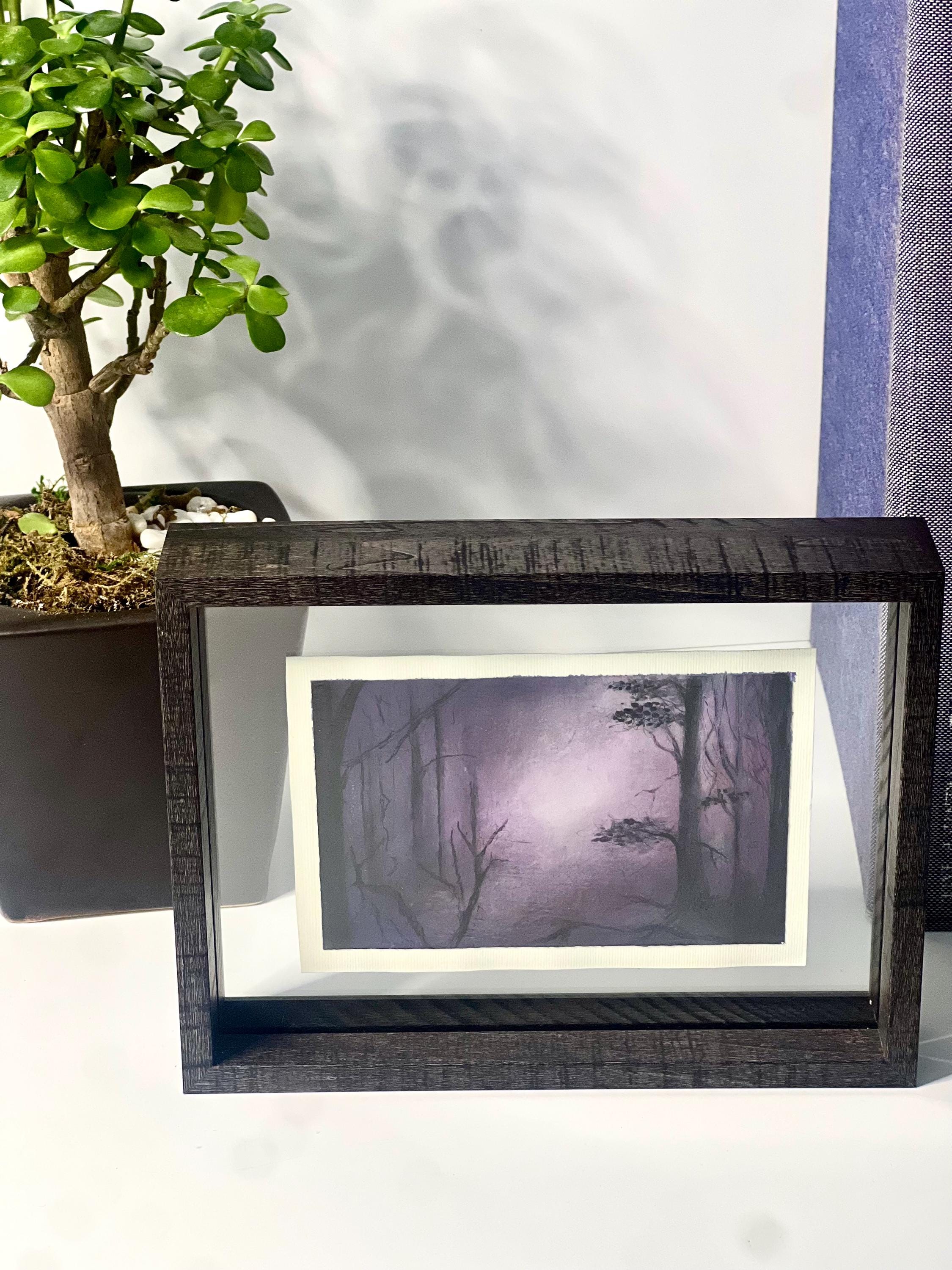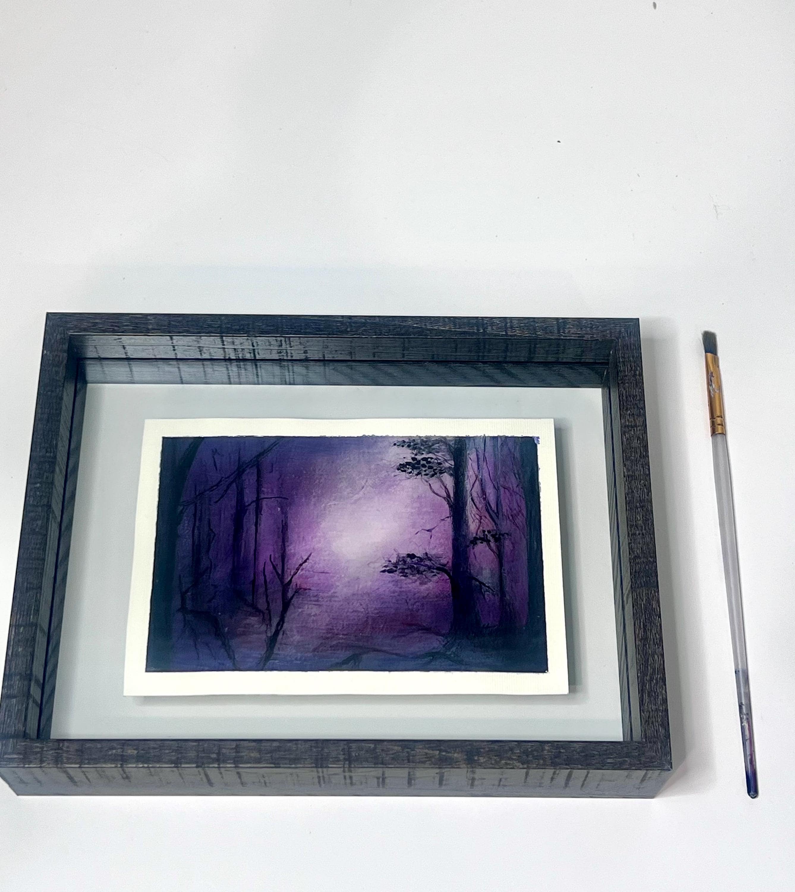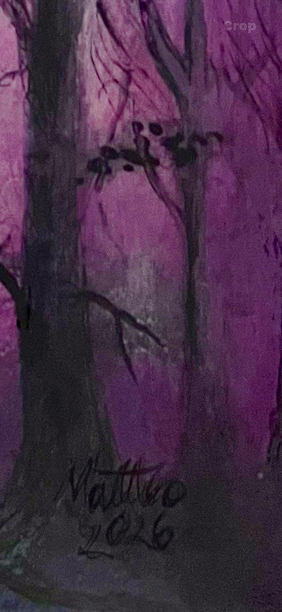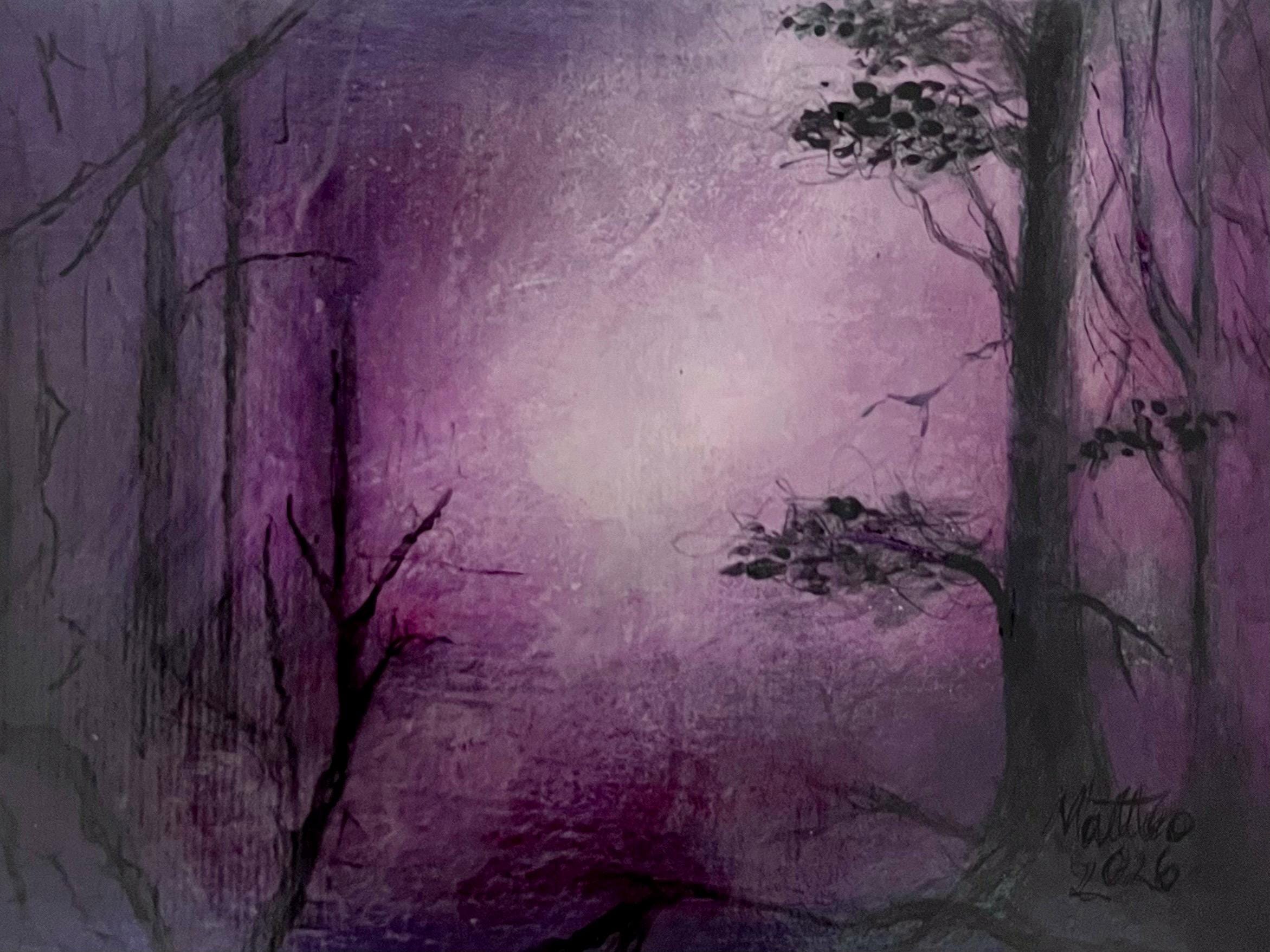 Into the Quiet is an original acrylic painting by artist Matteo LoBue, inspired by moments of stillness and reflection. Layers of violet, soft pink, and shadowed forms create a dreamlike forest scene where light gently emerges from the center. The contrast between darkness and glow invites calm, introspection, and emotional pause.